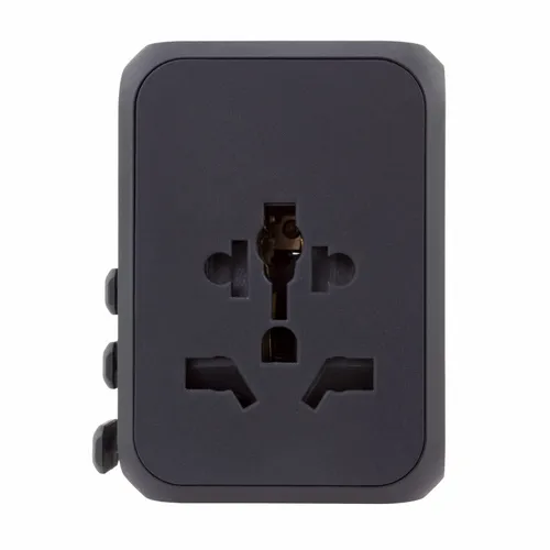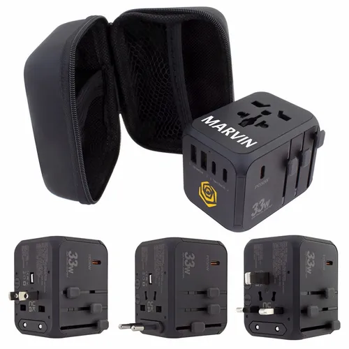 A travel adapter that is perfect for teams that need to travel often for business. Comes with Type-C ports and two USB ports that allow you to charge multiple devices simultaneously. Features: Covers more than 150 countries with US/EU/UK/AUS plugs Built-in safety shutters protect users from the direct touch of the live parts on the socket outlet Only one plug-type can be used at one time by sliding the knob selection, other plug-pins are locked automatically