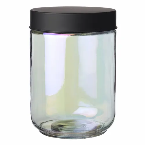 33 oz Glass Storage Container. Metal Screw-On Black Lids Included. Iridescent Finish on Glass for a Luminous Look. Anti-Slip Grains Embossed on Bottom. Great Promo Item for Cookies and Candies. Add a Stylish Element to Your Kitchen. Recommended Hand Wash Only