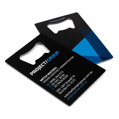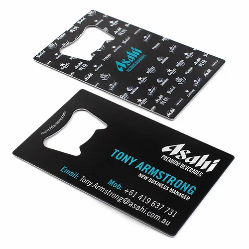 Combine practicality with promotion using stainless steel bottle opener business cards. Each card features a fully functional bottle opener along with your branding etched directly into the metal for a durable, long-lasting finish. A unique and memorable way to keep your business in hand.