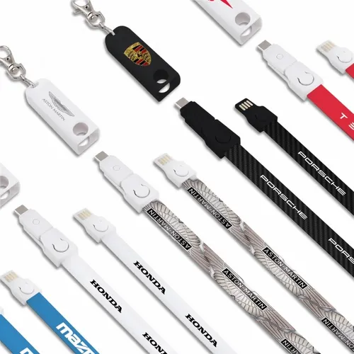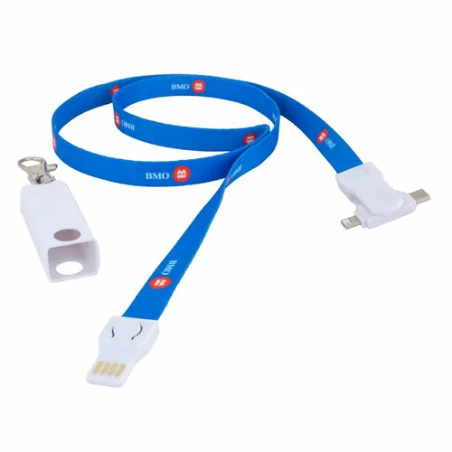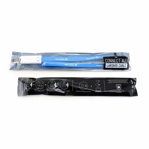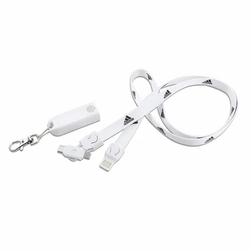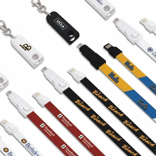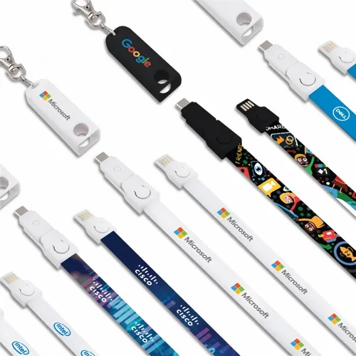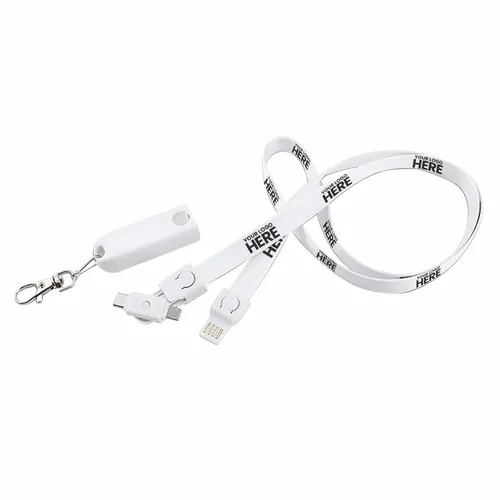 The perfect item for conventions, trade shows, and sporting events. Fashionable and Convenient with nice full color branding area on the fabric strap. The Connect All Lanyard Charging Cable charges all Smart Phones with it's Type-C tip and combo tip for 8-pin style and Micro-USB charging. Simply detach the key chain clip and the lanyard to become a 3-foot charging cable. Full-color print available to clearly display a client's logo. NOTE: Badge holder not included.