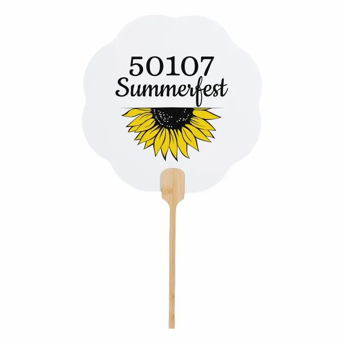 A custom wedding hand fan is a foldable handheld fan made with an 8-inch cardboard surface and a 6-inch bamboo handle designed in a smooth half-circle style. Available in shapes such as circular, hourglass, petal, and ellipse, these fans come in a default white color with a gray-white handle, making them versatile for personalization and decoration.