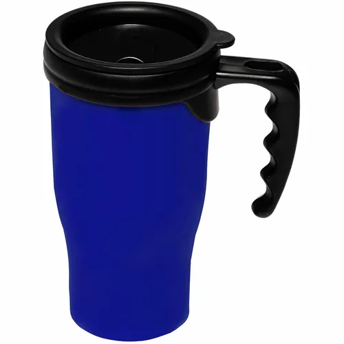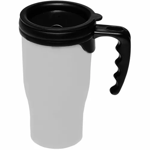 14 oz. Color Acrylic Outer Shell Insulated Travel Mugs. Acrylic Insulated Inner Liner. Plastic Lid with Spill Prevention Slide Lock. Easy Grab-n-Go Hook Shaped Handle