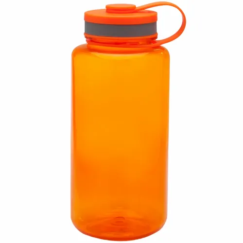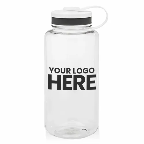 38oz Plastic Water Bottle. Wide Mouth Bottle with Screw on Cap. Color Matching Trim. Transparent Outer Wall