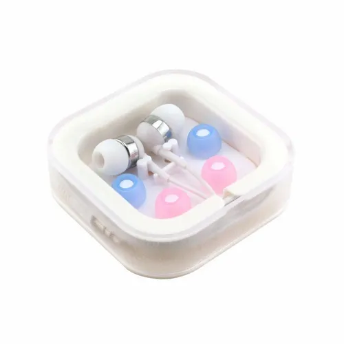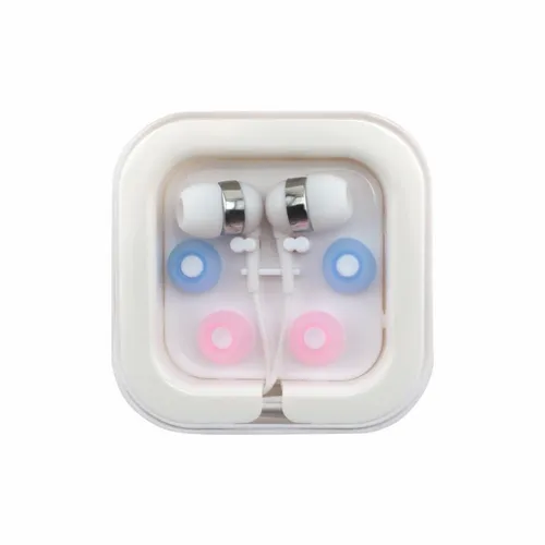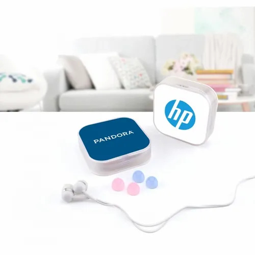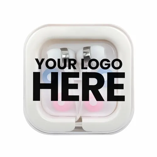 Plastic ear buds in a square case with interchangeable ear bud covers. Print your logo on the case for a fun giveaway item!