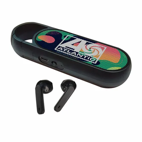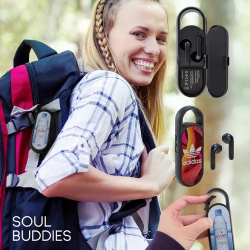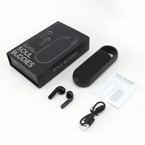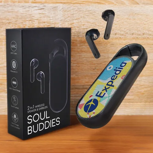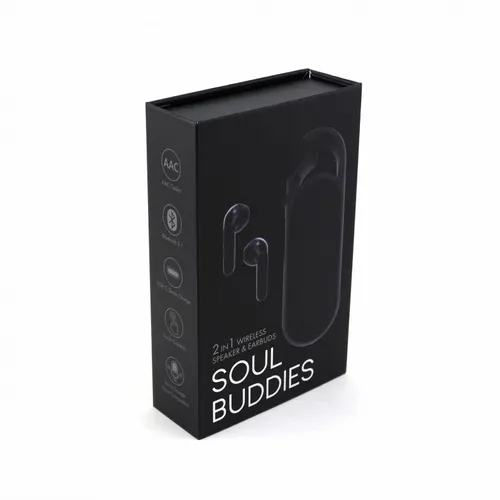 Soul Buddies combines a portable speaker and wireless ear buds into one amazing fun and convenient audio device that is perfect for many occasions. Simply connect your device to the wireless speaker to share your music with friends and switch to private listening with the ear buds stored inside. Plus, its clever design includes a spring-action lever clip to easily attach this device to a backpack, handbag, or carrying case.