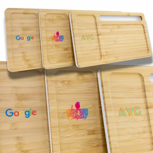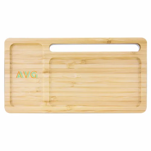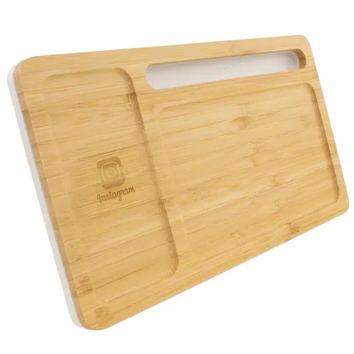 It's a bamboo-topped desktop charging phone tray. It will help maintain a tidy desktop, wirelessly charge a phone, and has an additional spot for business cards. The long and narrow groove is a convenient space to prop up a phone. It has a large visual space for branding and the natural color and modern design will match well with an office environment that is bright with life.