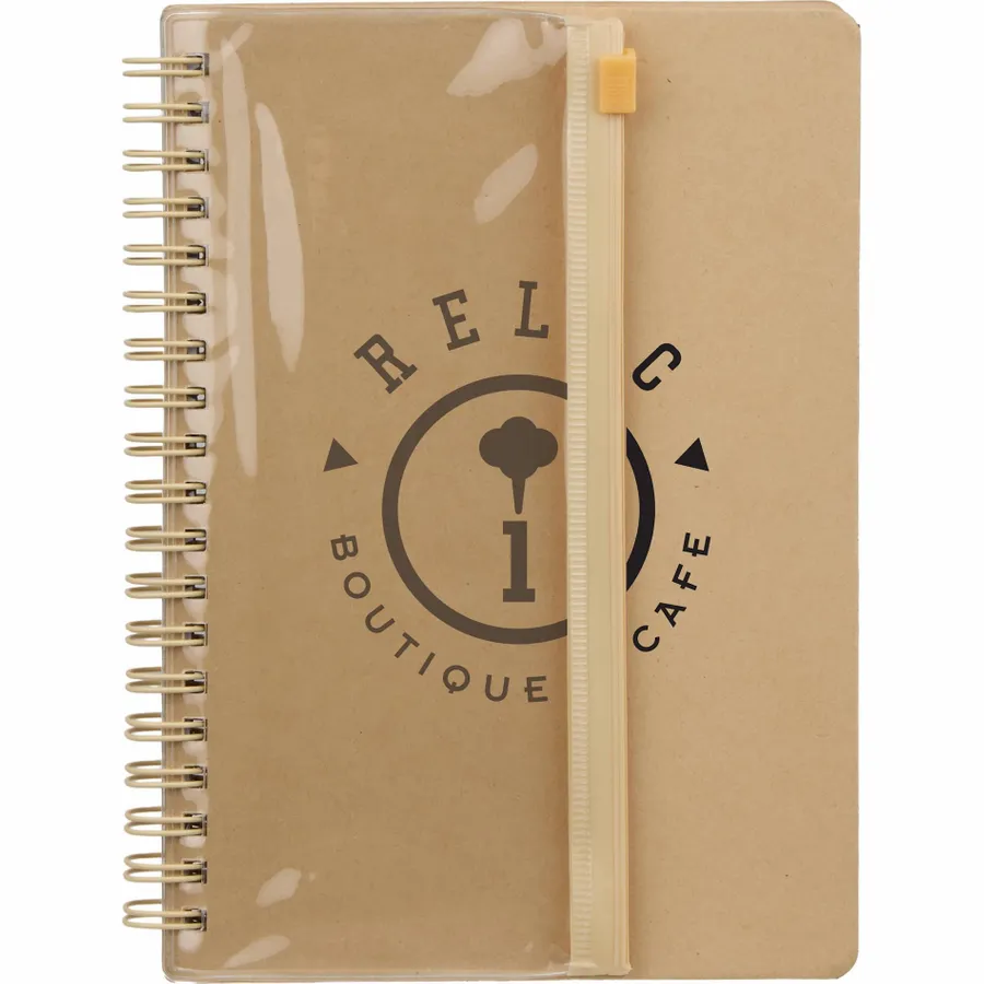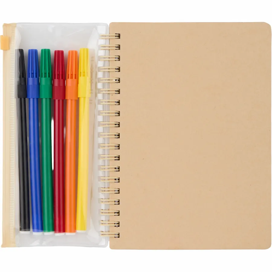 Unleash creativity with the 5 x 7 FSC Mix Doodle Notebook with Markers. It includes a spiral notebook with 60 sheets of FSC mix paper (lined and doodle pages) and 6 watercolor pens (black, red, yellow, green, blue, orange). The kraft cover is FSC mix and features a resealable transparent PVC pocket for storing the pens when not in use. Note: shelf life is 1 year. By choosing this notebook, you’re making a positive impact on the environment through a partnership with 1% For The Planet, as a portion of each sale supports environmental nonprofits.