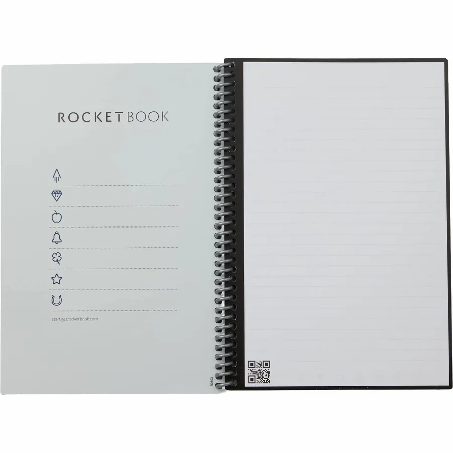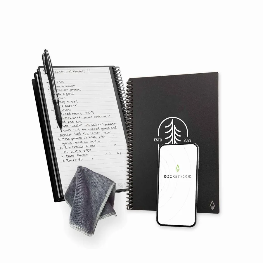 The Rocketbook Core Executive Notebook Set is designed for every classroom, office, and personal mission. This set features a premium notebook with 36, lined reusable pages made to connect to your favorite cloud services. The Core is made with patented reusable Core technology. The synthetic paper allows you to write smoothly with a Pilot FriXion pen, then magically wipe clean with a damp cloth to reuse again and again! Scan and upload your written work directly to cloud platforms like Google Drive, Dropbox, OneNote, etc. and access your notes from anywhere. Use Smart Titles and Smart Tags to name and organize files efficiently.Then, erase and reuse your Core for your next adventure! This set includes Rocketbook Core Notebook, Pilot Frixion Erasable Pen, microfiber wipeable cloth, instruction manual and retail gift box.