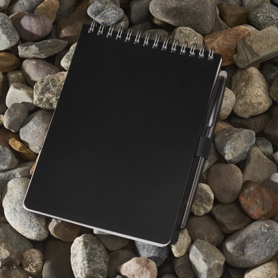 The 5” x 7” Mineral Stone Field Reporter Notebook with Pen features a recycled PP cover, 64 sheets of lined stone paper and silver wire binding. Includes a RPET erasable pen with black ink and elastic pen loop. Through a partnership with 1% For The Planet, one percent of sales of all EcoSmart products are donated to environmental nonprofits. Note that pens are packed separately.