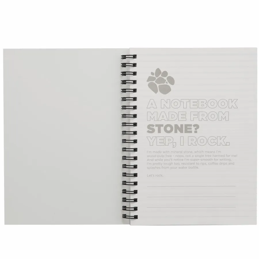 The 5” x 7” Mineral Stone Field Spiral Notebook features a recycled polypropylene cover, black wire binding and 64 sheets of white lined stone paper. Through a partnership with 1% For The Planet, one percent of sales of all EcoSmart products are donated to environmental nonprofits.
