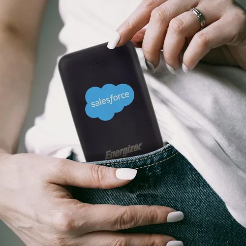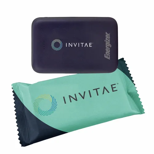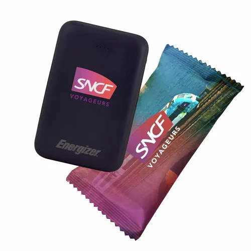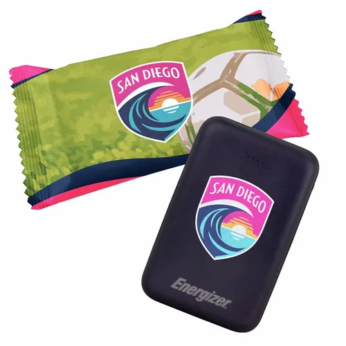 A great looking Energizer power bank with 5,000 mAh battery capacity wrapped in a fun candy wrapper. It's a great device for daily use for any busy professional.