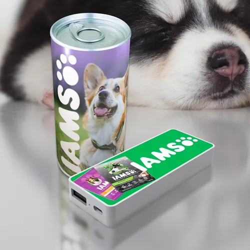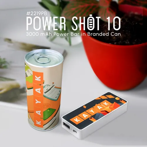 Power up your phone with the PowerShot 10. 3000 mAh Power Bar in fully customizable wrap packaging that resembles an energy drink pop can. Phone battery getting low? No worries, simply pop open the PowerShot 10 and connect to the Power Bar to re-charge your phone!