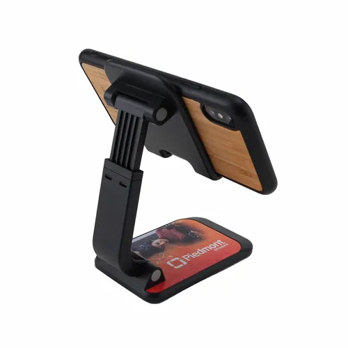 The Phone Stand helps busy teams keep their phone screens visible on home or office desktops. It reliably holds a phone in an elevated and upright position and will not block a phone's plug-in port. It is easy to use and keeps your hands free during those important video virtual meetings. So you can feel more comfortable and confident when closing that deal or presenting your next great idea. When not in use, it is foldable and compact so you can take it with you anywhere.