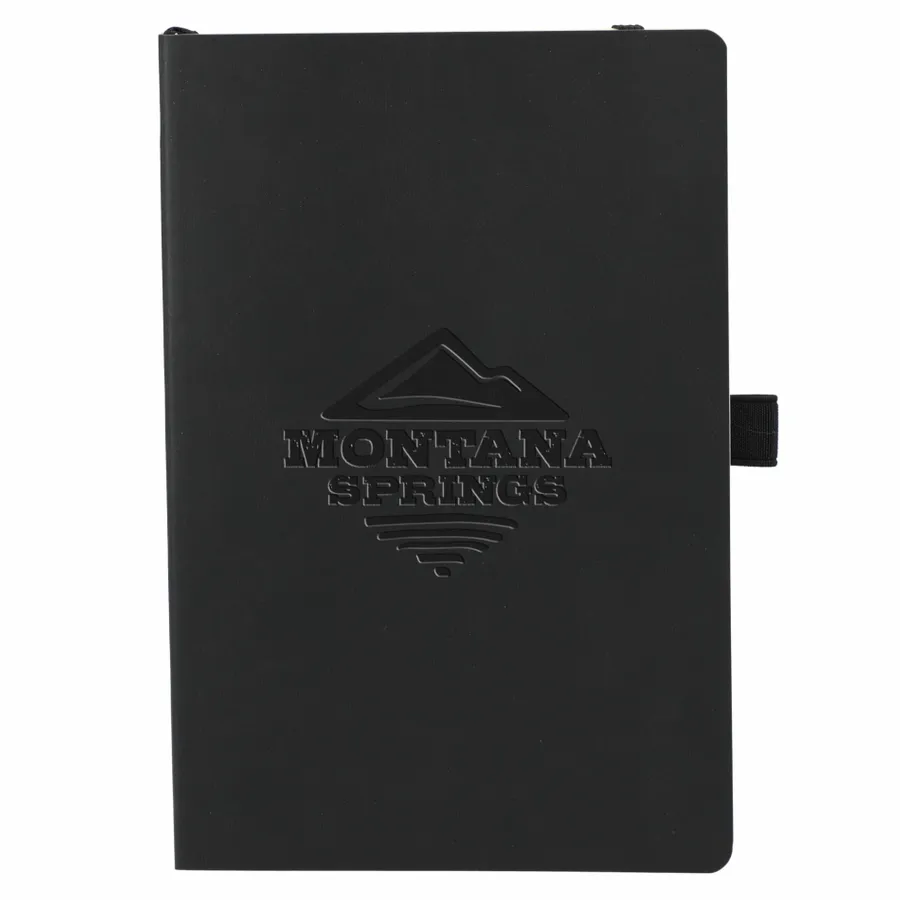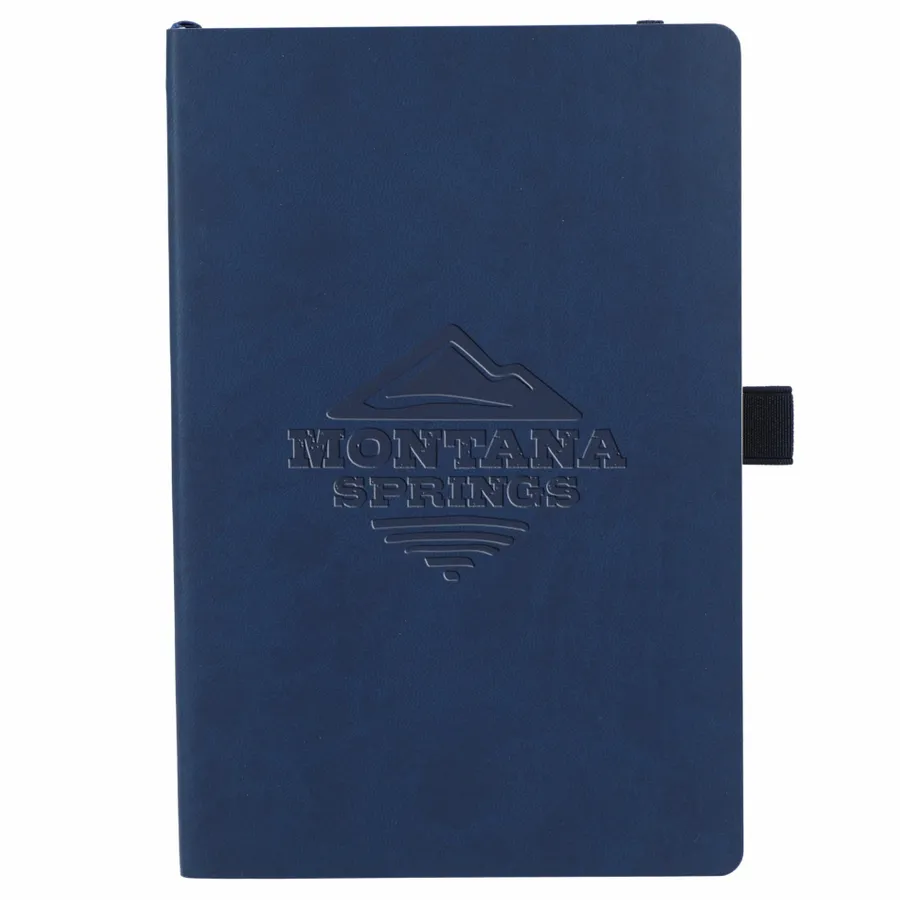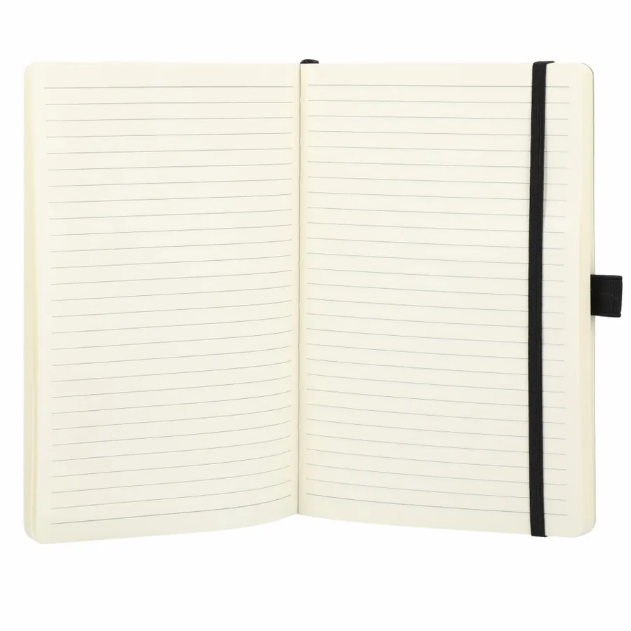 The 5.5 x 8.5” Skiva Recycled Soft Bound Journal features a recycled polyurethane cover and 80 pages of recycled cream lined paper. Includes document pocket, color matching elastic band, pen loop and ribbon page marker.