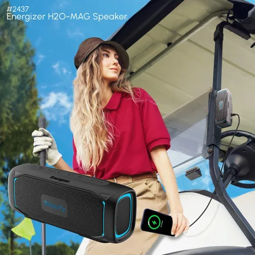 The Energizer Mag-N-Stand speaker is designed for outdoor activities with iPX5 rating. 10 Watts speaker drivers deliver clear and powerful sound. It is not only a speaker with 4000 mAh battery capacity, it has a Type-C port that can charge a phone or other portable devices. It also has strong built-in magnets for easy mounting on golf carts and other metal surfaces.