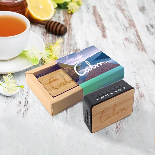 The Sound Machine is our new and easy-to-use wellness device. It provides six types of sounds to help busy business professionals find calm during or after any busy day at home or office. Beautiful sounds play from a built-in speaker on the back. The opposite bamboo side panel displays a cleanly etched laser-engraved logo. It is a compact device that can be easily kept on desktops or stored in baggage for travel.