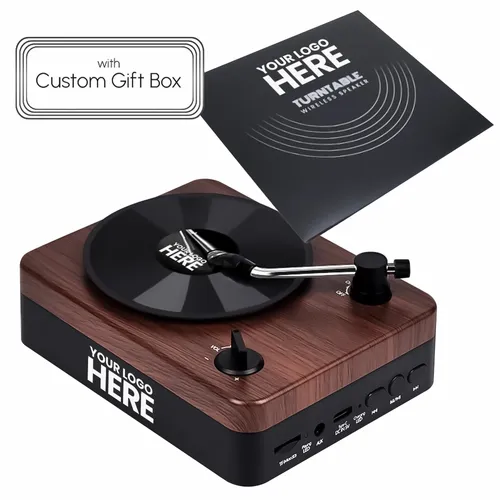 The wireless Turntable Speaker adopts a classic retro design, combined with perfect sound quality to bring you an excellent audio experience. The Turntable Speaker is packaged in a gift box and can be decorated with a custom decal on the faux vinyl record and your logo printed in full color on the side of the Turntable Speaker.